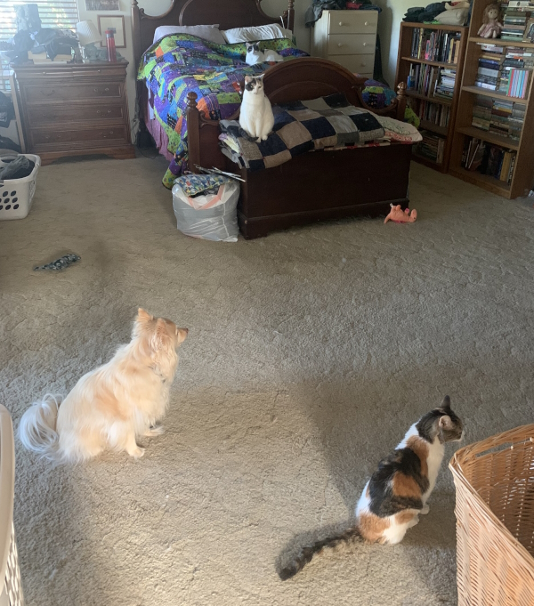 Um. Three. Three Not Cats. Nope. Those aren’t cats. Not surprising. We’ve had raccoons before. They are cute, but not feeding any more of them. Probably explains the ‘cat poop’ in the backyard that the dog is totally interested in too. And I think that’s the dog’s bowl, so that should be interesting when the dog comes back. Hmmm.