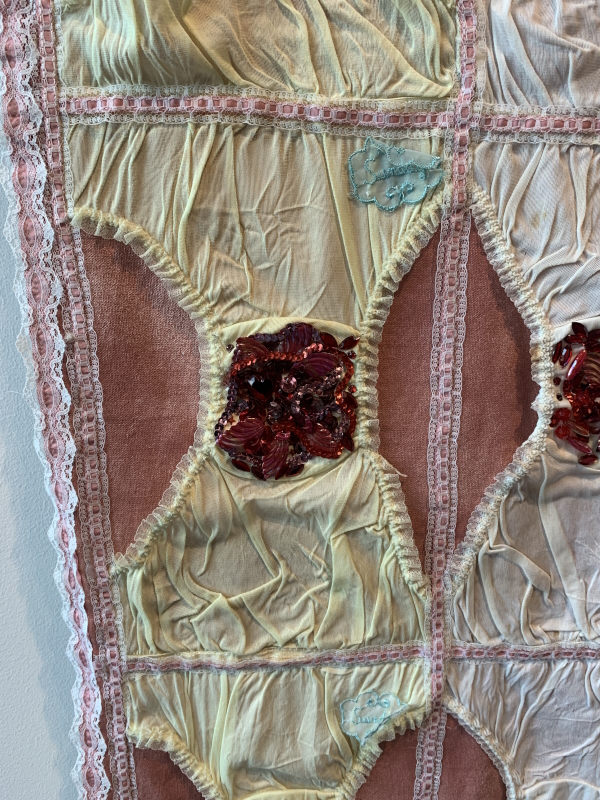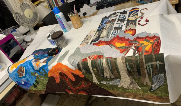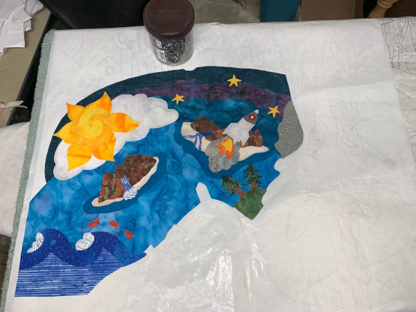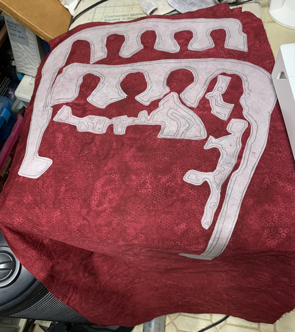 So last night, during my stitching Zoom, I pieced the background and laid the image on top of it, and ironed the bottom half down…