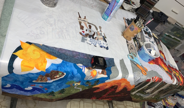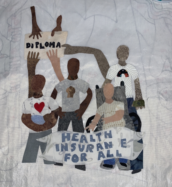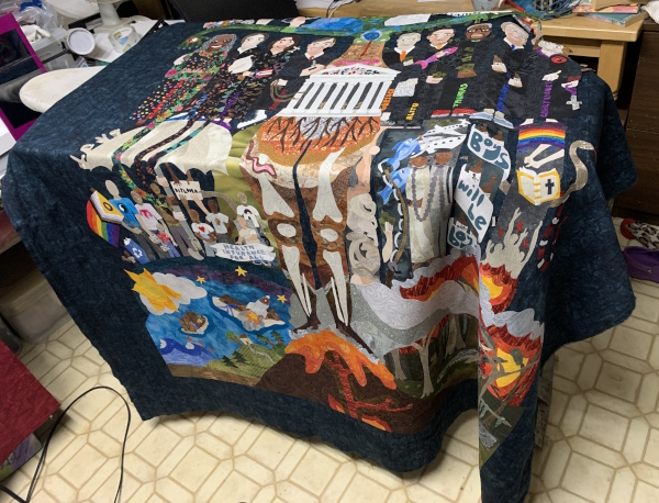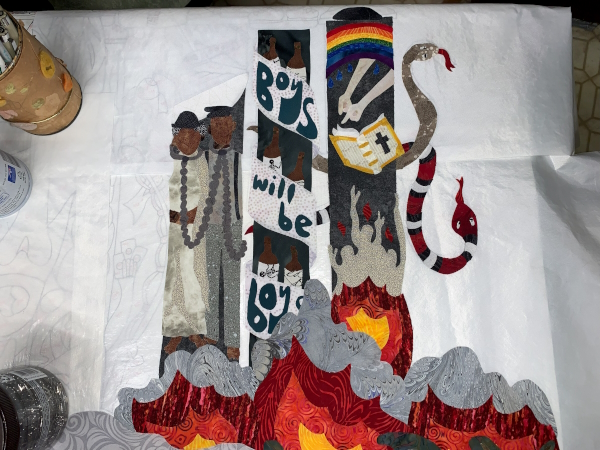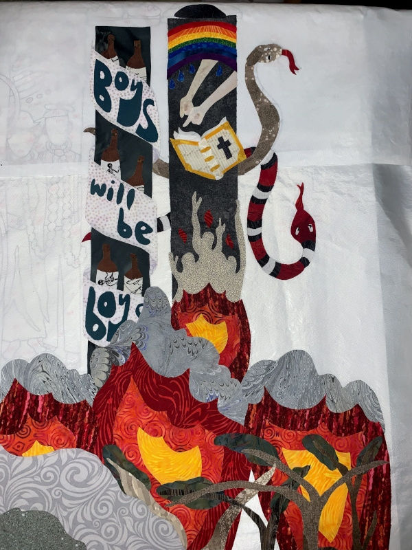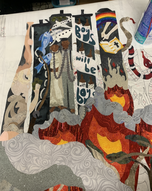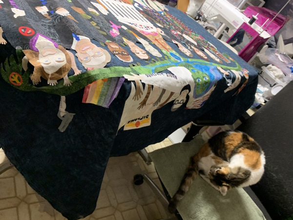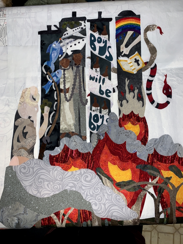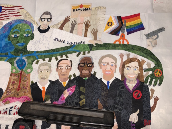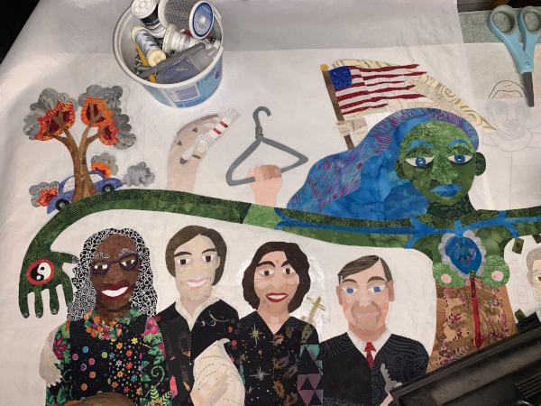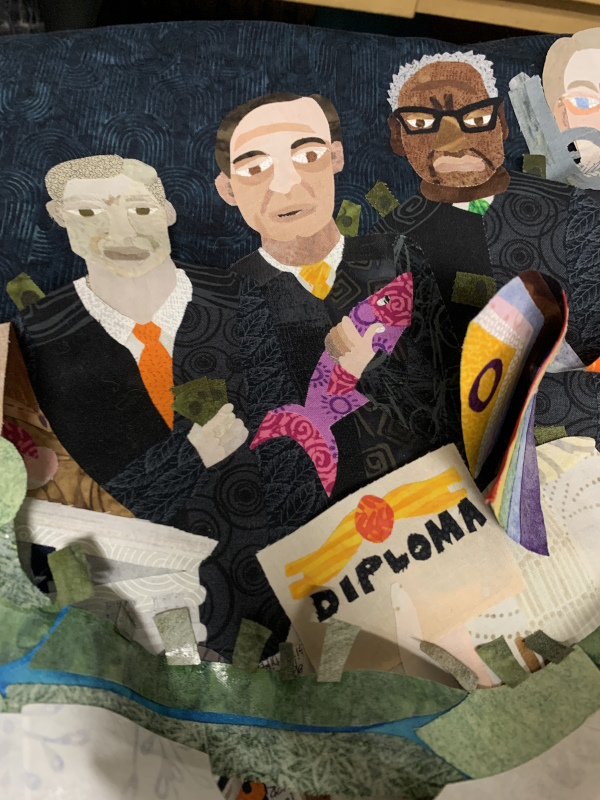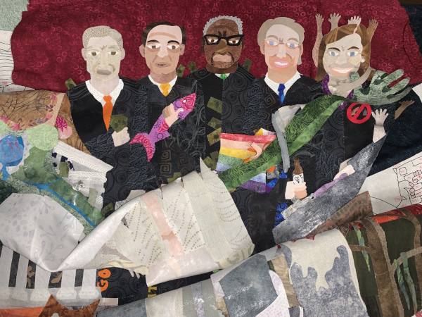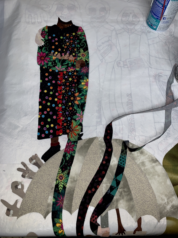 I have changed the background fabric on other quilts, but not often. The difficulty here is if I go lighter for all of it, there are issues with other parts of the quilt. But that blue is too close to the justice’s robes.