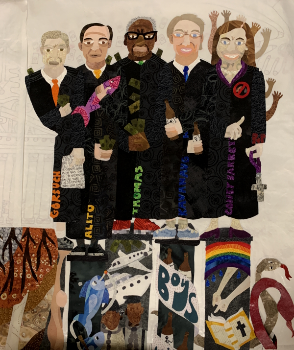 Cool! I thought. I just need to iron it to the background. But a friend had suggested the drapes in the Supreme Court might be burgundy (they’re not, but that’s another thing). I had originally thought to put just a lighter blue behind them, but the idea of the drapes coming down from the goddess’ arms really appealed to me.
