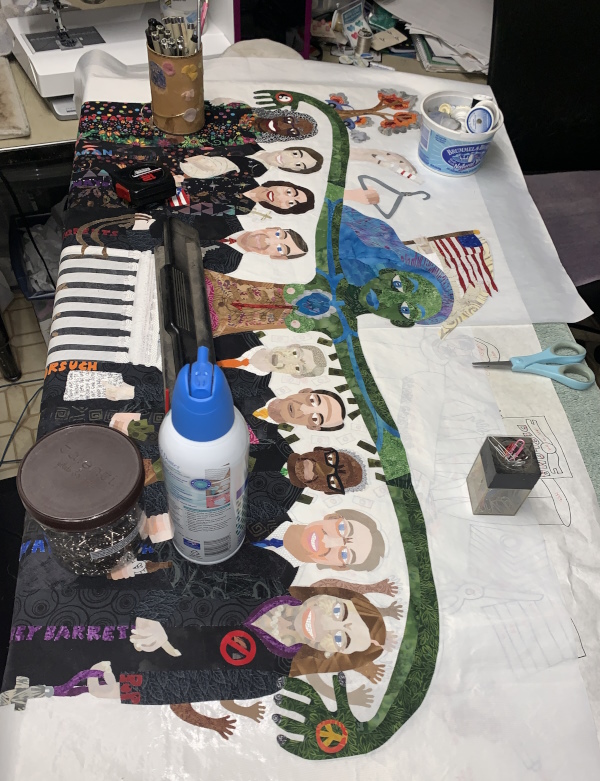 So I had hoped to be done ironing last night, and I would have been, except Art Brain objected to the background behind the justices, so I had to scramble a bit. It’s OK…the scramble took 36 minutes so far. When I tell people I keep track of my time to make these, I’m not sure what they think. I have a tracker. I turn it on when I start and off when I finish. I track each task, which is really useful when I need to figure out WHEN THE FUCK I can move on to the next step. Seriously. I’m at almost 29 hours on the ironing and there’s probably another hour. I guessed 30. That’s pretty good.