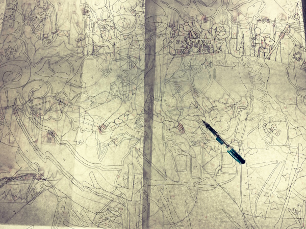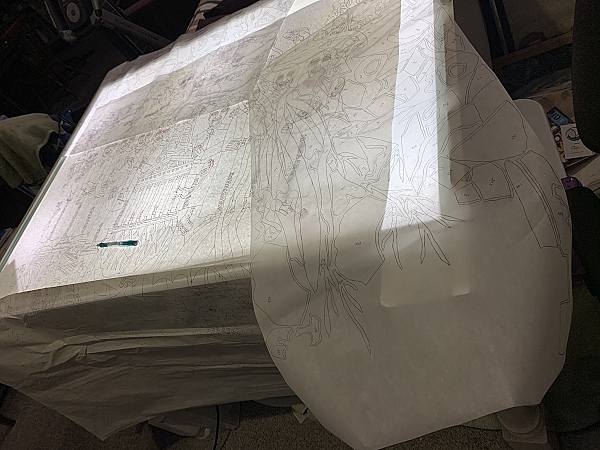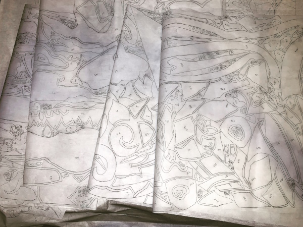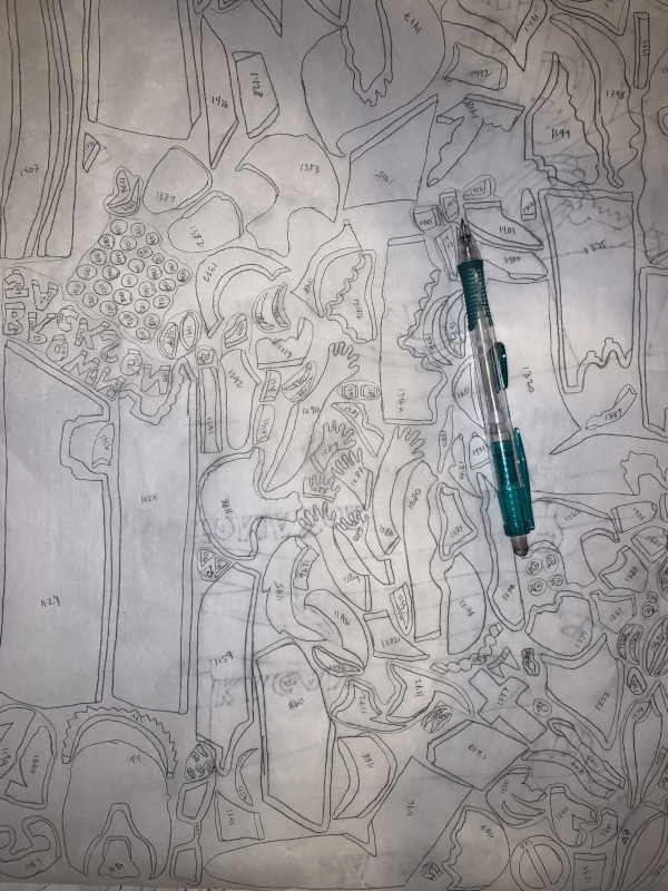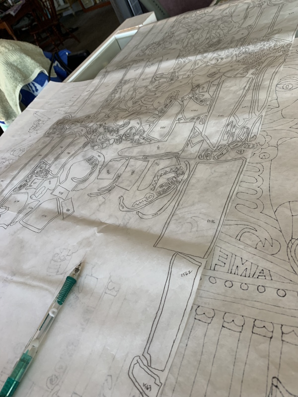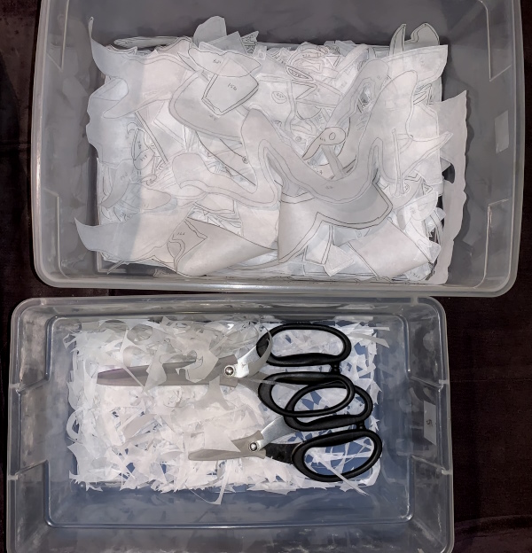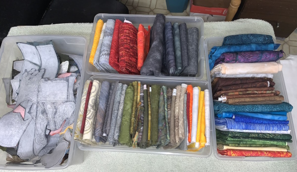 Usually I would crop photos like this so you only saw the fabrics, but then I was like, no, let them see the chaos. Iron on the edge because all the boxes of the rest of the pieces are taking up so much room, teacup full of tea, unfinished stuff everywhere, fan on because it’s still warm in here at the end of the day. It’s supposed to be 102 degrees next week. Not a fan (ha ha I’ll need a fan though). So this was clean up. Put all the piles in the bins so I can see them. The bin on the top left is all flesh tones, and I’ll need to go darker still for some of the justices. Probably pinker too. Lots of pink. Too much pink. Next up? The umbrella and then, FINALLY, the goddess legs. That will go quickly. Dirt and roots.