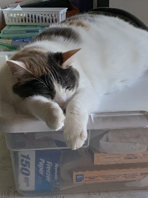 Well, on top of all that, Nova has a bladder infection that might be part of a genetic issue, so she’s on meds. Kitten’s gastro stuff got significantly worse, so the Man picked up 5 meds for her last night because I couldn’t get to the vet in time. She doesn’t feel well; she actually hissed at me this morning. That said, she took all her meds and is back to sleeping in the blue fabric drawer of fabrics I will have to wash to get clean at this point.