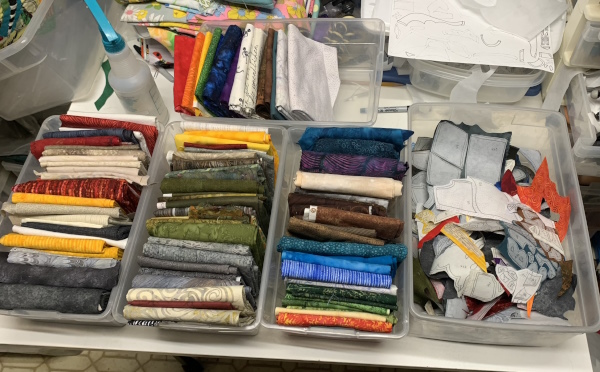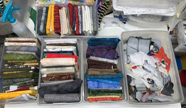 So this is what it really looks like while I’m ironing. Piles of fabric that I pull out, I go get more from my drawers, I pile those up, there’s piles and piles. And then I put them all in the bins to make it neat each night for the photo. This thing has a lot of fabrics in it and I’m not even halfway.