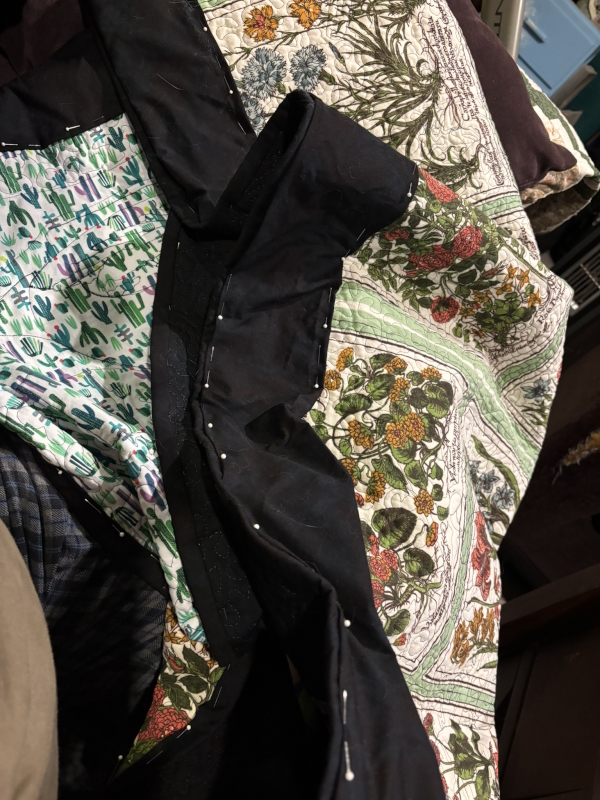 And last night, I put the sleeves on, zigzagged all the seams because I was trained as a clothing sewer before I became a quilter (does everyone zigzag their seams? I just think it holds all the layers together in a more stable manner so it’s easier to fold the binding over and stitch it down.). Then I pinned the whole thing and stabbed myself a million times. Yes, I know there are clips and basting sprays (ugh) and other ways to bind quilts. I like how this looks, so I stab myself a bunch of times for the pleasure of the final product. Tonight, I’ll start the handstitching part. I’ll be working on that for a while too. But the quilt will be done in February. Not December. Not January. Sigh. WHATEVER. 2025 might be kicking my butt at the moment.