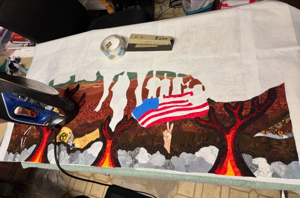 I’ve ironed about halfway through the 200s, I think? There’s a pile of stars to go on that flag, and then I start on the little people who are kneeling on the edge of the flag. This is not fast, but it is pretty rewarding, because it’s the first time I get to really see it in color, besides in my head. I really love the red African fabric I used in the volcanic bits…it shades from bright to dark and looks really good. Yes, fabric makes me happy.