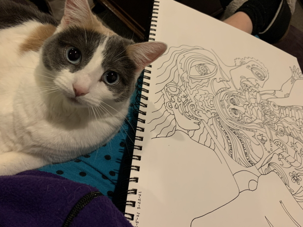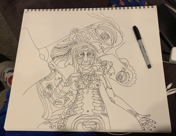 The plus in all this is that the next quilt drawing is coming along, mostly because I’m using the drawing I did in Tehachapi, all stream of consciousness while hanging with the man and watching weird stuff on the telly. Apocalyptic Love, Death, and Rockets, yeah? No, not Rockets…ROBOTS. Oh my. Hello brain. You want a scalpel today? Seems like a mistake, but sure…we’ll give you a scalpel. WTF. ANYWAY. I cut some paper to the right size and added the elements I needed for this theme, and then traced a goodly portion of the existing drawing…