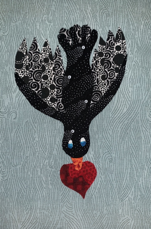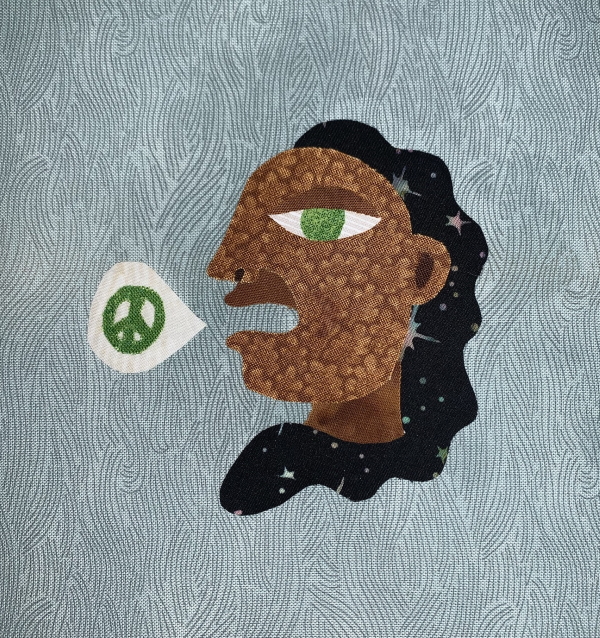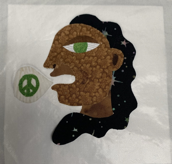 Look at the pile of fabrics provided. What do you see? How do they all go together? She needs an eye and IDK what else. More flowers. Perhaps that is a hat and not hair, and she still needs hair. A bird on her head maybe. I think they’re all facing one direction though. We’ll see. This one is different than the other ones…an entire scene instead of just a woman. Interesting.