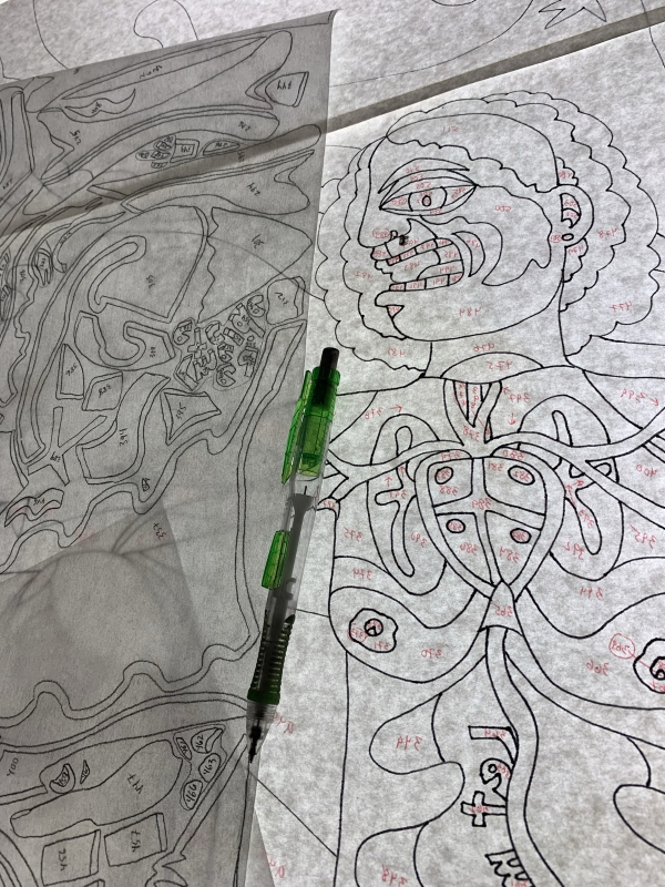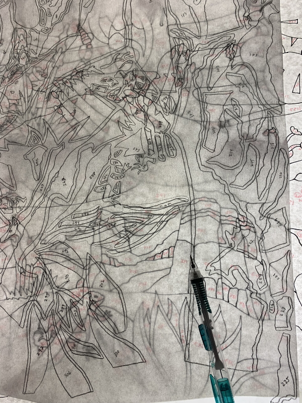 I am a quarter of the way through, but as I was tracing last night, I found a whole section I hadn’t numbered, so now, instead of 1329 pieces, I think there are 1372. Stay tuned for more brain farts.