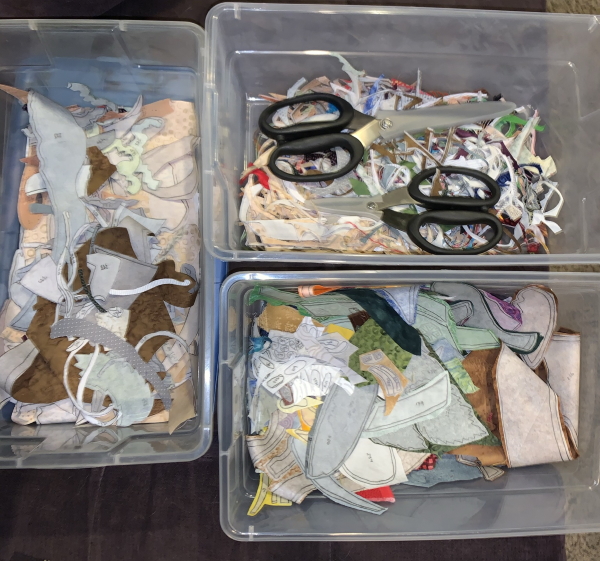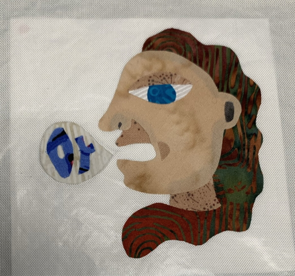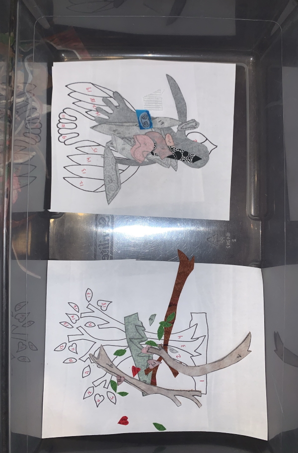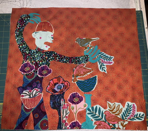 Look at the pile of fabrics provided. What do you see? How do they all go together? She needs an eye and IDK what else. More flowers. Perhaps that is a hat and not hair, and she still needs hair. A bird on her head maybe. I think they’re all facing one direction though. We’ll see. This one is different than the other ones…an entire scene instead of just a woman. Interesting.