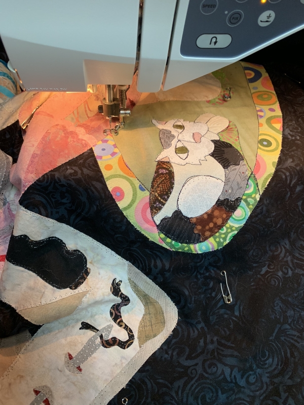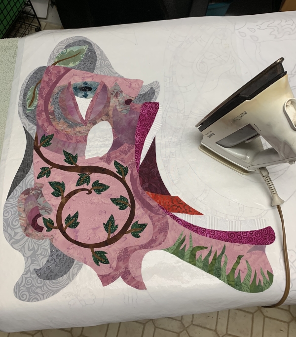 There was some logic to how I did the stitchdown, and I seem to be following that order for the quilting. I should think about quilting all the in-between spaces as I do the outlining…maybe admit now that I will be using the same color? Or not. Decisions.