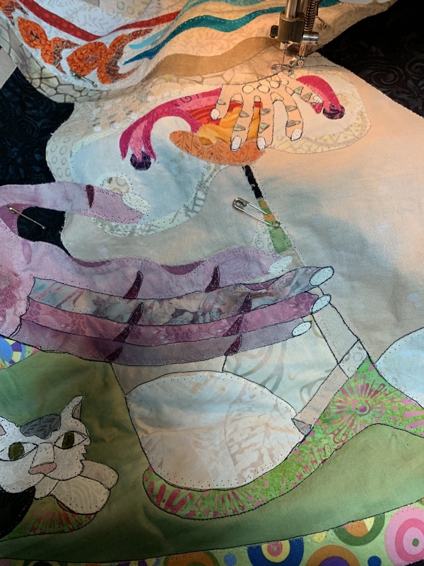 Just those mountains left, then the torso, arms, head, and sky. That’s tonight. Hopefully. And the background. So I can buy binding tomorrow and get this puppy done. I have No Freakin’ Clue what I’m working on next. I know I said that before. I’m saying it again. Oh yeah, I need to put a Patreon video up this weekend too, but I’ve gotten pretty good at editing them now, so it’s really only figuring out which of the 15 videos I recorded to use. The Man is playing in two shows this weekend, one of which I can’t go to anyway and the other one, eh, I’m good, I have a lot to do…but it means I’ll barely see him this weekend. I guess I will get a lot of work done, including some copyediting and maybe even schoolwork, although I’m kind of putting the quilting first so I can get it to the photographer early next week. It’s all good! I’m also debating teaching a class, just real short, introduce people to how I make stuff…I got asked to do it. I didn’t search it out. I have been going back and forth about whether to do it or not. It’s paid…but that’s not why. I wonder if it’s something I would want to do. That’s all. So I said yes. I think. Sheesh. I’m crazy. It’ll be FINE. Seriously. OK. This day. This weekend. Quilting will be nice.