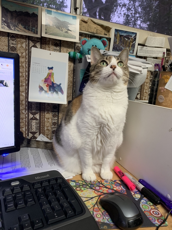 My cat freaks me out. I’m sitting here, typing at (staring at?) the computer, and she’s sitting there watching me, and then all of a sudden, she snaps her head up toward the ceiling and is STARING, like there’s a demon punching through the ceiling, so I stop (immediately) what I’m doing and stare at whatever space of bumpy ceiling SHE is staring at…and I see nothing. All the hairs on the back of my neck are up, but…ghost? Bug? She’s just fucking with me? I just don’t know.