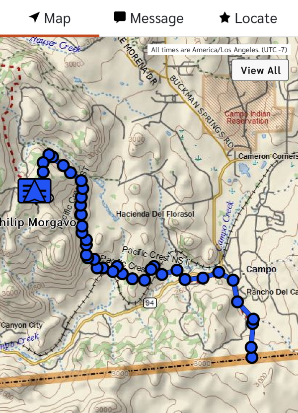 Sometimes the Garmin gives some pretty amazing pictures. He did go UNDER the freeway. He’s in a town now, waiting for his appointment. Hopefully he’ll feel OK tomorrow and will be able to get back on the trail. I know yesterday was rough…over 19 miles down 5200 feet or so through a burn zone with limited water. In the heat. Certainly a challenge. I’m proud of him for doing this, even if I miss him tons.