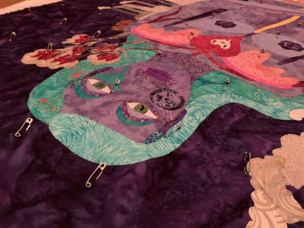 Speaking of not enough time, I really am trying to up the ante with this quilt, getting it done in an insanely small amount of time. How? Grabbing minutes when I’d normally do something else. I had 45 minutes yesterday afternoon before driving out to an art meeting, so I ironed instead of lesson planning. I had 30 minutes waiting for the Man to get dinner ready…same deal. I got the room cleaned Saturday in the hour before going to see his show, and when he sent me an updated start time (later), I sat down and got half a really complicated exhibition entry done. It’s good, but it feels like I can’t ever just sit down and relax. Hence my post-break feeling of no, not rested, not relaxed. My fault, but semi-necessary at the moment. I’m not letting another year of school fuck up my ability to make art. I’m gonna figure it out.