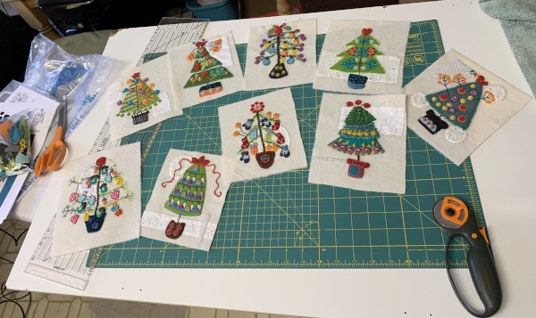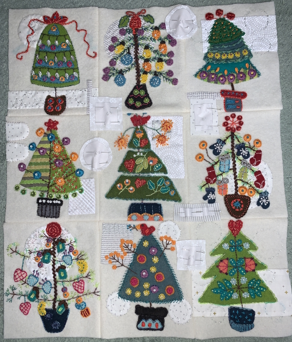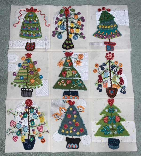 One of the fun things about this is that the seam allowances sometimes get a little tiny. Luckily, I’ve done quite a few of these and know how to fix that. Sometimes you need to re-embroider something over the seam allowance…like that bottom tree branch on the right, and the bottom of the pot in the middle one…plus the blue bits at the top of that tree. No worries.