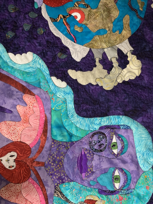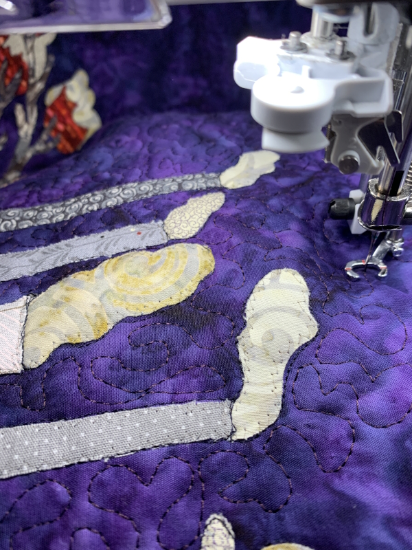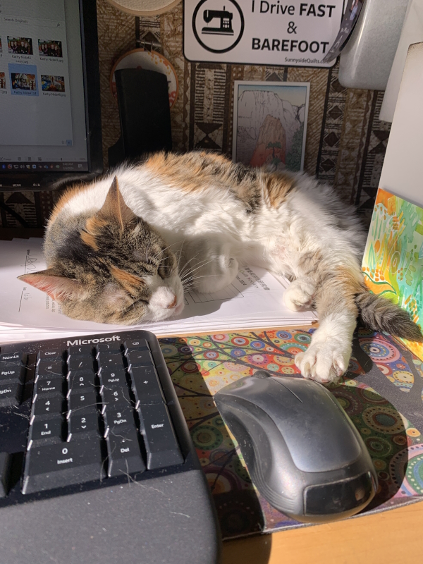 It’s dark and gloomy this morning. That California storm finally hit us last night, but not super hard. We’ve had over half an inch of rain and a tiny bit of thunder and lightning…nothing like up north. Enough that I don’t have to water for a few days though. Enough that I don’t feel a need to leave the house today. Wait. I need binding fabric for this quilt…I want to finish it before the 26th so I can contact the photographer and give him more time…and the fabric store I usually shop at has heinous hours these days. Which they say they aren’t changing. So it’s today or tomorrow, and tomorrow is more complicated. I did finish stitchdown on Wednesday…just sat down and did it all after writing the blog. That is one of the things I miss about teaching before COVID…coming home for the weekend and spending ALL DAY Saturday just doing art stuff. It’s hard to pull that off these days. I always have to do all the stuff I didn’t get done during the week. Stitchdown took a whopping 2 hours and 44 minutes, then I sandwiched and pinbasted that night, so I put in 3 or 4 hours.