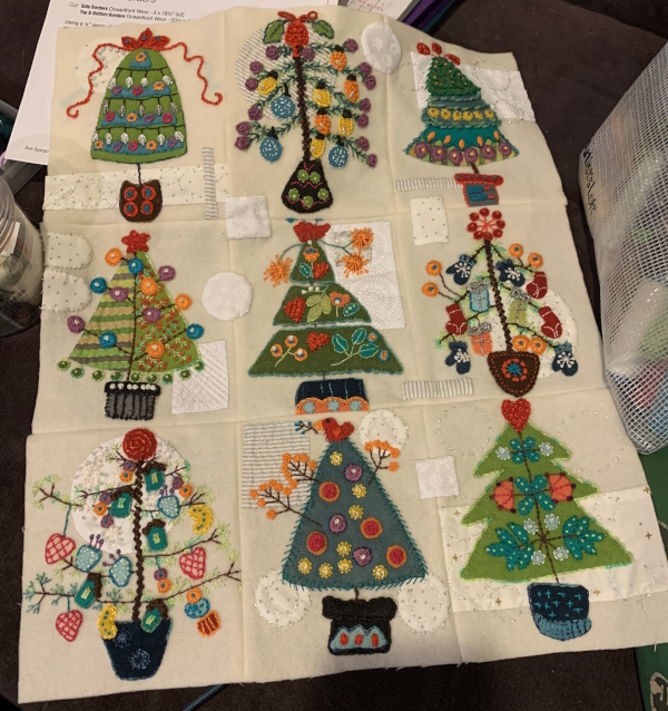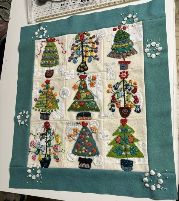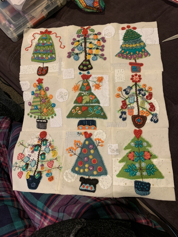 So this is Sue Spargo’s Tinsel block of the month from 2022. I wasn’t going to do it, but mom likes Christmas stuff, so I signed up. I thought I’d just make it for her, but realistically, I wouldn’t finish until 2030, so I did all the applique, gave her three blocks last Christmas, three for her birthday in February (a little late because I got sick), and three for Mother’s Day. She did all the embroidery, which is the fun stuff anyway, right? Then she handed them back to me in September or October.