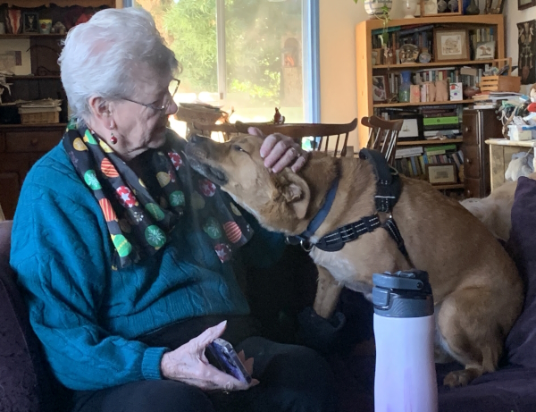 Annie is still injured, so the cone is on most of the time. She licks her paw otherwise…occasionally she’s allowed out with supervision…Grandma is her favorite…
