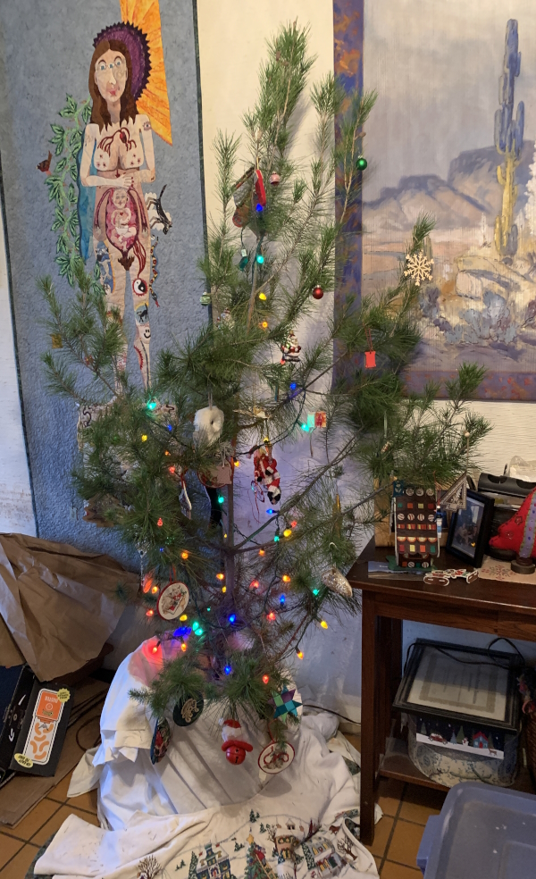 Here’s my tree, which is already undecorated and back outside, so it can (1) enjoy the rain and (2) not be eaten by Kitten, who keeps throwing up the needles. Sigh.
