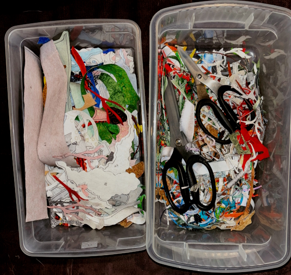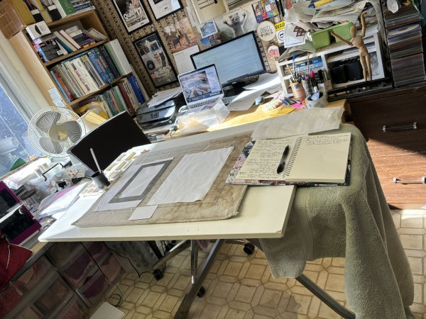 Then I stared at them and tried to decide what to do. These are all just random drawings, mostly while camping or traveling, some during the Winter Break Draw-a-Day things I like to do (no time this year). So they don’t have a purpose or a theme to them, which is fine. I think of them as practice for the real stuff, but although I feel like I just finished some really complicated stuff (still recovering from the Supreme Court quilt), I can’t just do a light, easy quilt right now. And most of these roll in that realm. Not really light, but not really purposeful. So I picked this top one (of the 11) and added paper to the bottom…which is where I’ll add some purpose. Whatever that is. I have some ideas, just not fully formed.