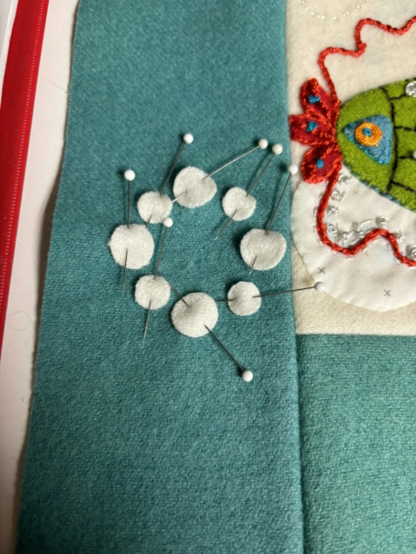 One of the other participants did it this way and added a bunch of different embroidered snowflakes randomly throughout the border, and I liked the way it looked better than the original. So my job is to applique down the 48 circles. Then I hand it over to mom and she does the embroidery. Then back to me to sandwich and quilt…she could probably do that, but that’s OK. I’ll give it back to her to stitch the binding down by hand. Then it’s hers. And when she’s gone, it’s mine. Unless my SIL or some other close family member wants it more. Then it’s theirs.