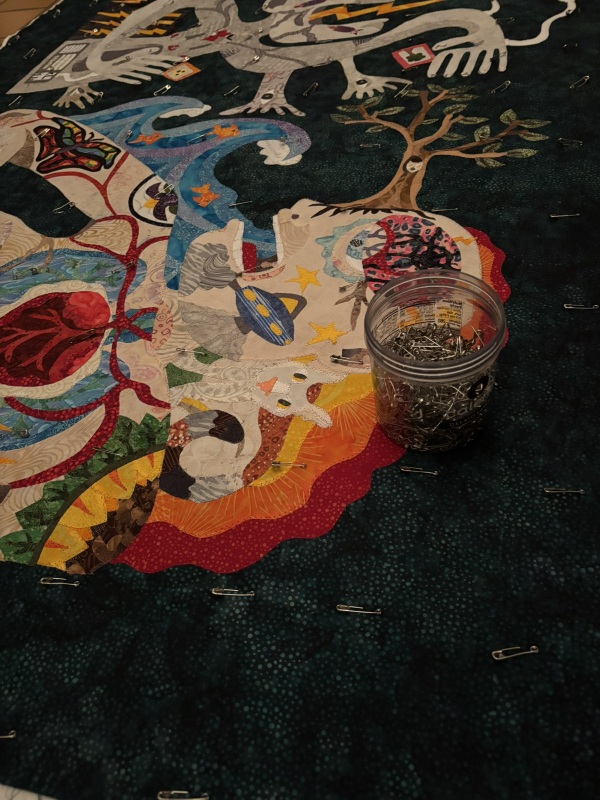 Mostly I hadn’t done it yet because I wanted to finish the bird one first (the bigger one) before stashing a bunch of safety pins in something that would just sit in a pile for a while. It’s a challenge to quilt this…mostly because I need to go AROUND everything. Not hard, just a pain. So it’s next on my list to finish this summer. But before I do that, I’m trying to piece together the improv piece I did on Zoom with Irene Roderick…