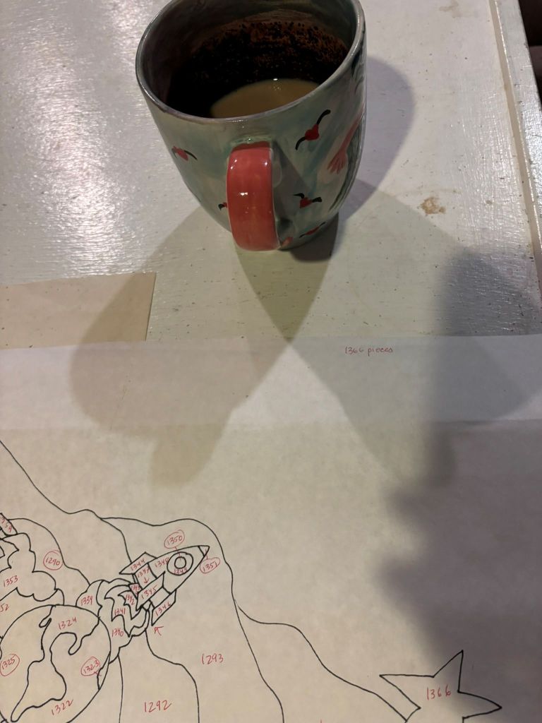I’m in the low 900s, so about 450 pieces to go. I’ve been tracing for 11 1/2 hours. Yikes. It’s been slow. I’m hoping to do a goodly chunk today and tomorrow. It’s supposed to get a lot warmer in a few days. Don’t want to be sitting in the window/hottest part of the house then. Although trimming will just be on the couch.
