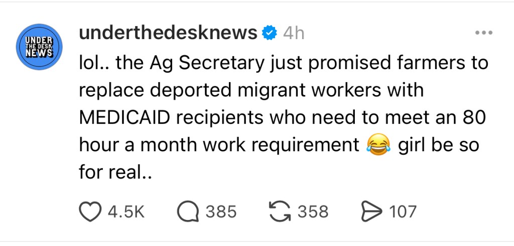 My Medicaid household member has a workers’ comp back injury. How is that gonna work? Are they going to drive him to wherever he needs to work? Are there farmers near here for that? Are they going to house the babies, children, and elderly who will be doing that work? The disabled? Absolutely so insensitive and idiotic.