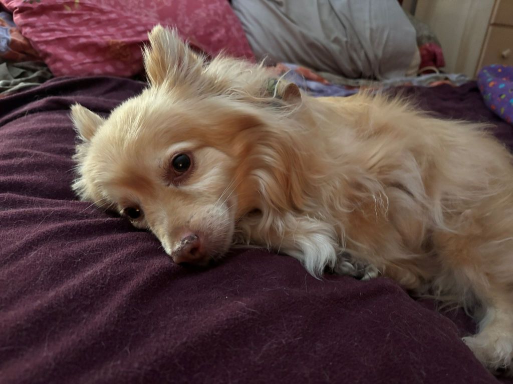 Simba after three hours of fireworks on THURSDAY night (not even the 4th, y’all). He barked the entire time. And I was tracing stuff, so I wasn’t making him feel safe.