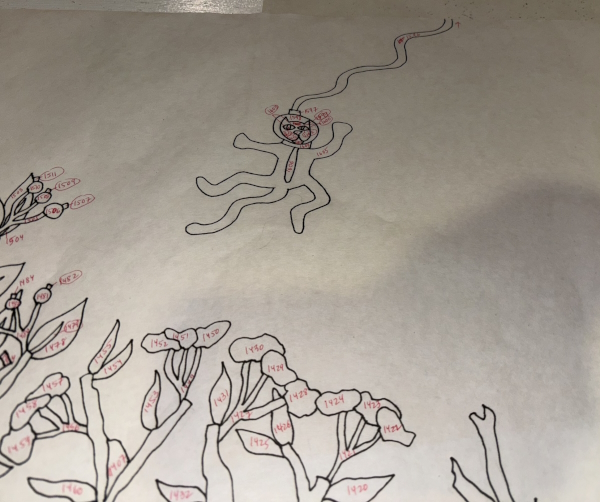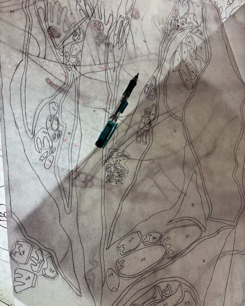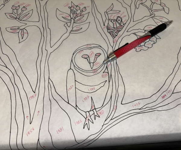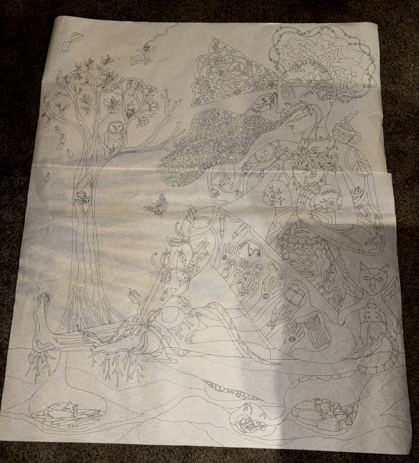 Then last night, I finished it, washed the batting, cut a backing and ironed it, then remembered the floor where I pinbaste was horrendously dirty, so I mopped it at 9:30 at night. Hoping it would dry in time (it didn’t). So all that is ready for pinbasting…and then I started tracing the next one, the banned-book piece…