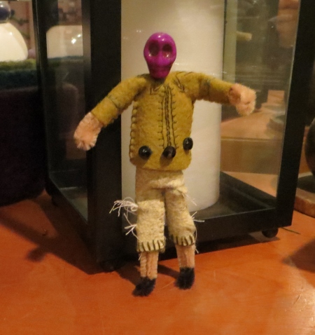 My very own ZombieMan. She’s been making fairies and somehow I inspired her to do a Day of the Dead Frida-Kahlo-esque doll a while back, and then we got on mummies or zombies or something, and I had the skulls, so she had to think on it for a while (because zombie-making is not one of her natural-born skills), but look what I got! I like him. Julie has some talent…
